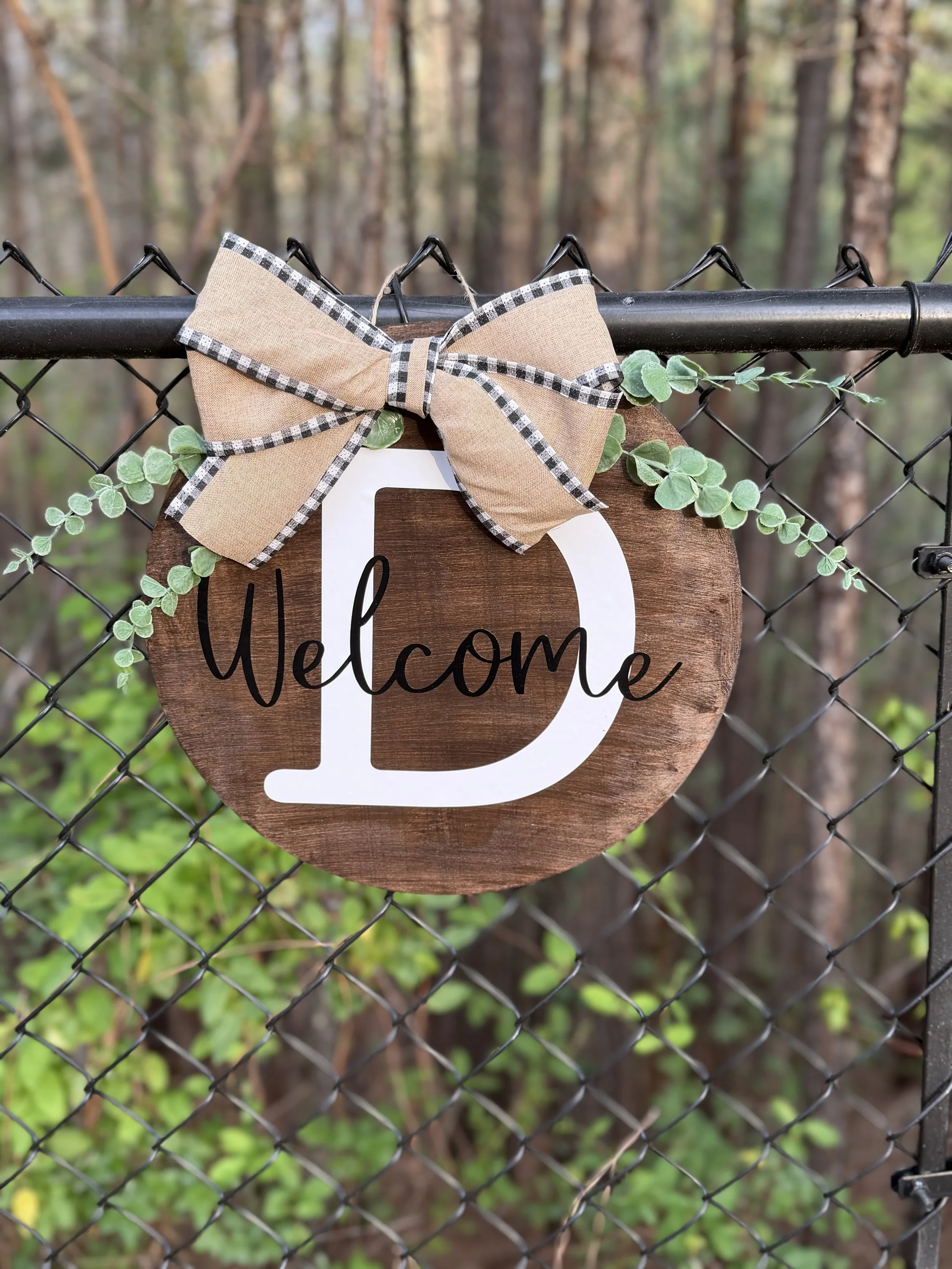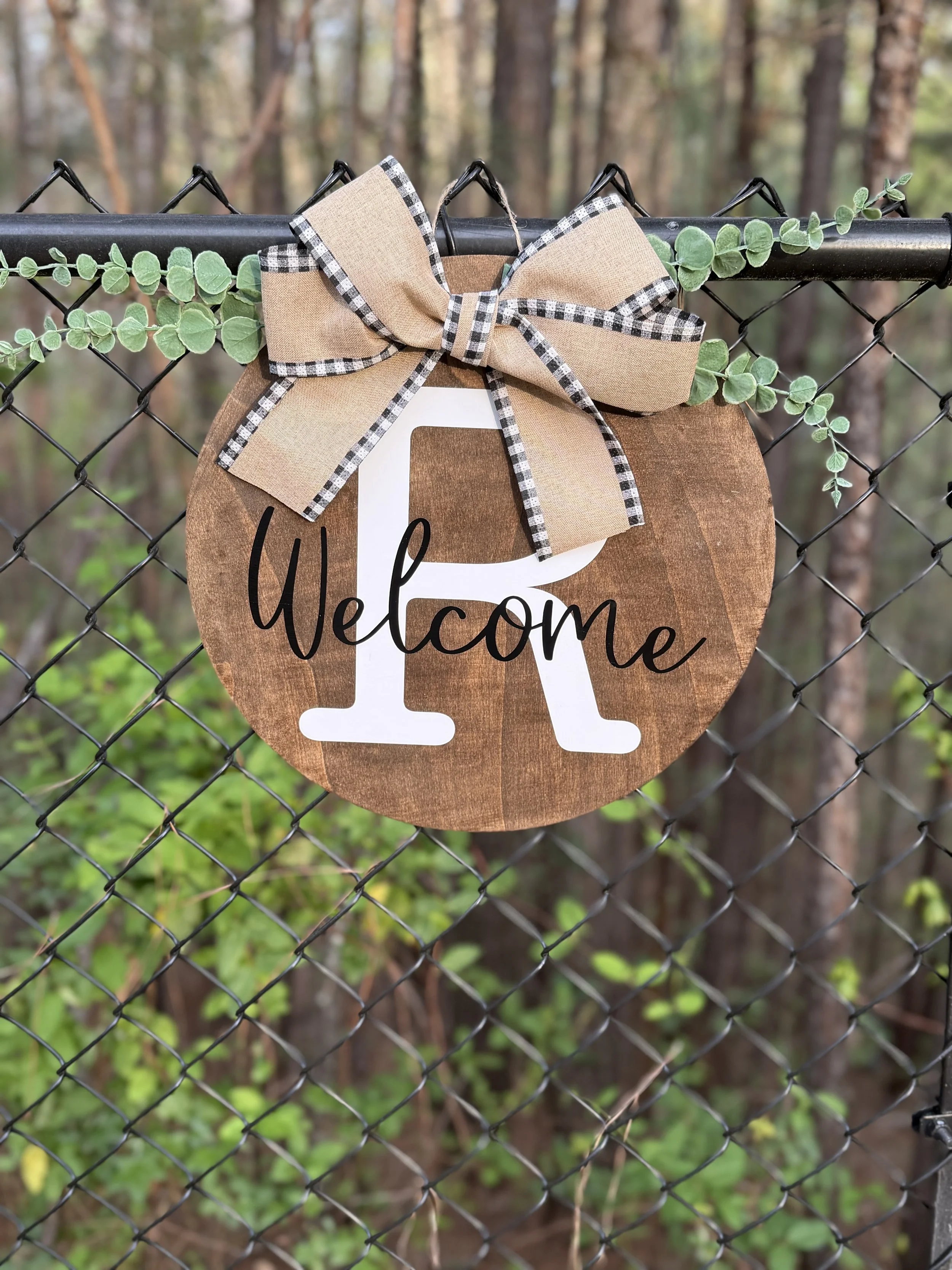 A warm and welcoming touch for your front door. This 14-inch handcrafted round wooden sign features a bold initial with elegant “Welcome” lettering, finished with a neutral bow and greenery for a timeless look.